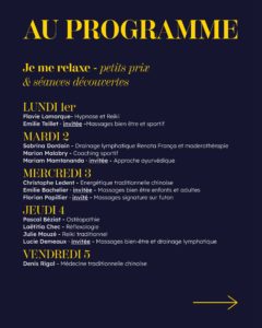 Vous trouverez ci-dessous le programme des offres pour toute la semaine de célébration avec les différents praticiens et coachs. Profitez-en pour découvrir ou redécouvrir ce magnifique centre !